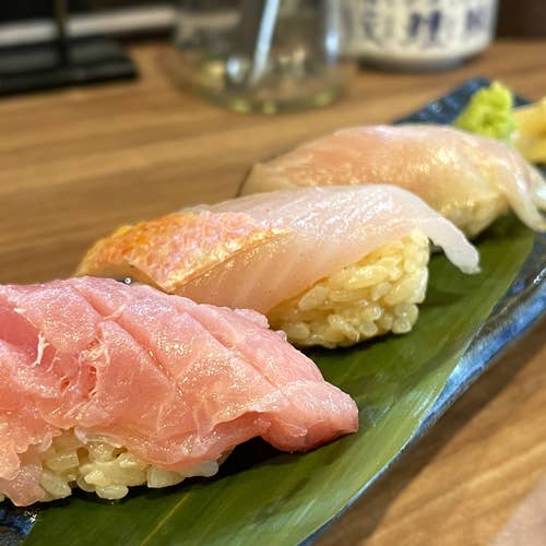 本鮪背トロと天然鱸の赤シャリの握りです。